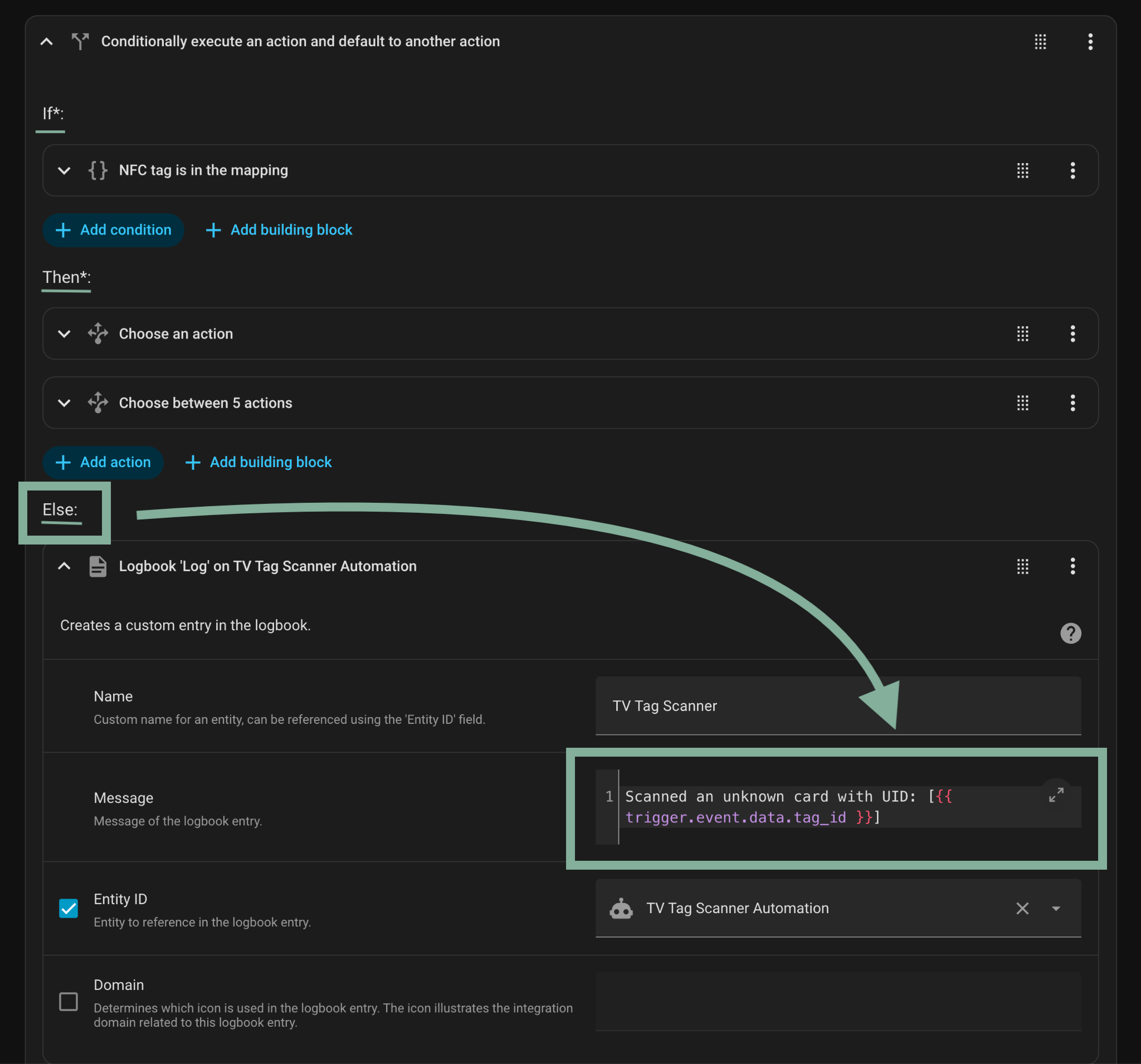 The trigger is a tag_scanned event, the same one we saw earlier when testing the scanner using the Developer Tools. The automation will be triggered when such an event is fired.