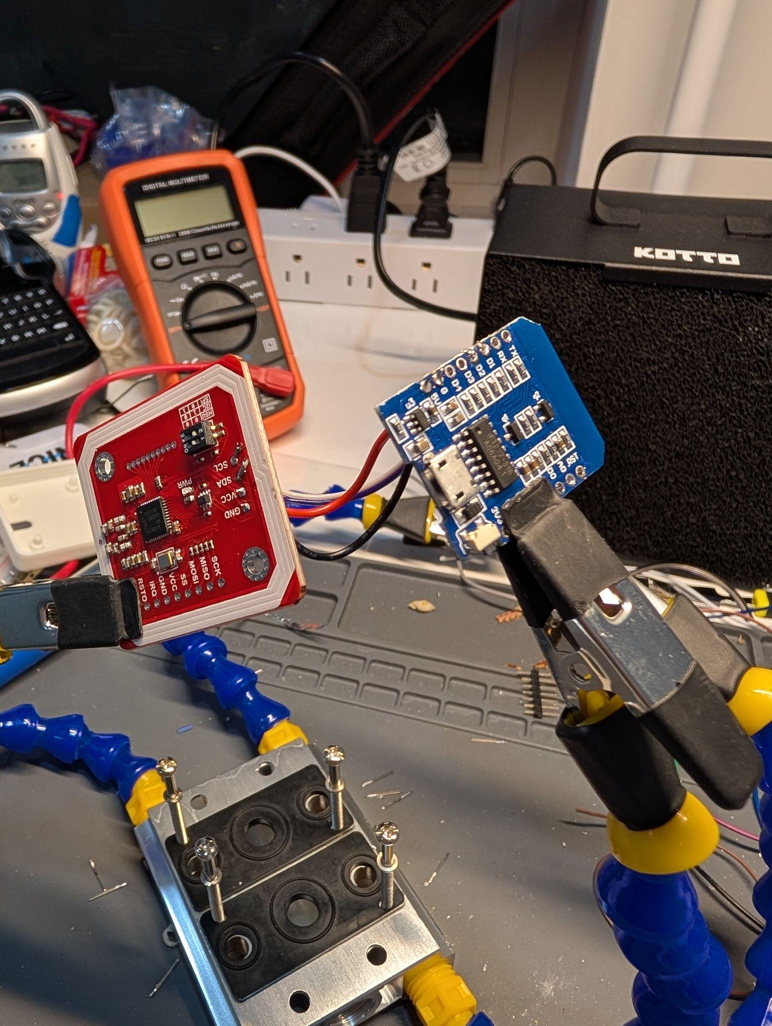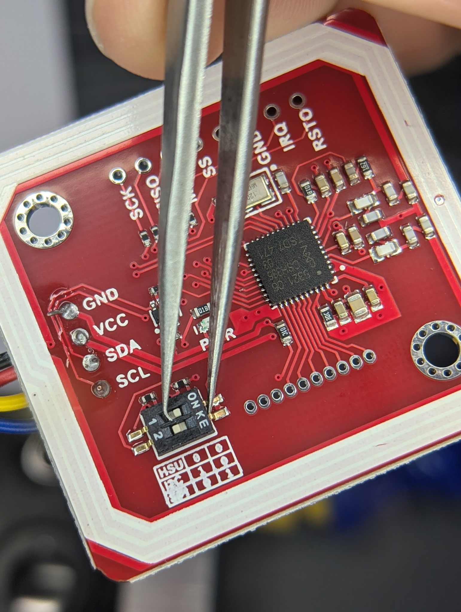 One critical step to note here: set the PN532’s mode correctly. The board has tiny DIP switches to toggle between I²C and SPI. Make sure these match your chosen mode - otherwise you’ll be staring at a non-responsive scanner and wondering why nothing works. Let’s just say I learned that lesson the hard way…