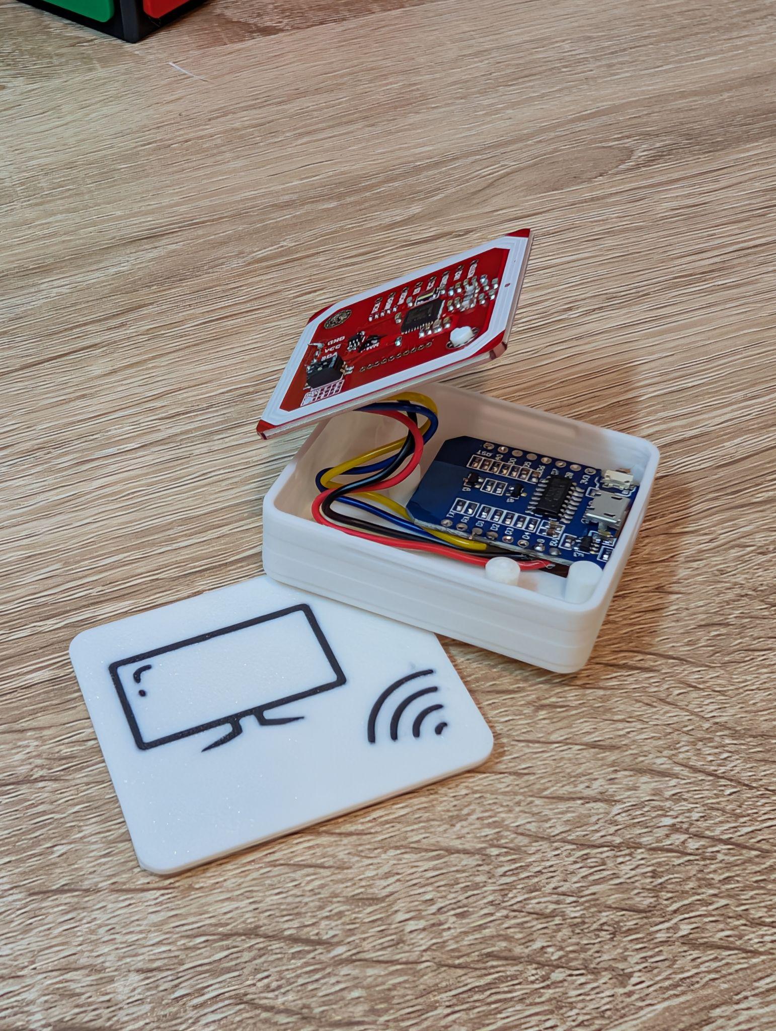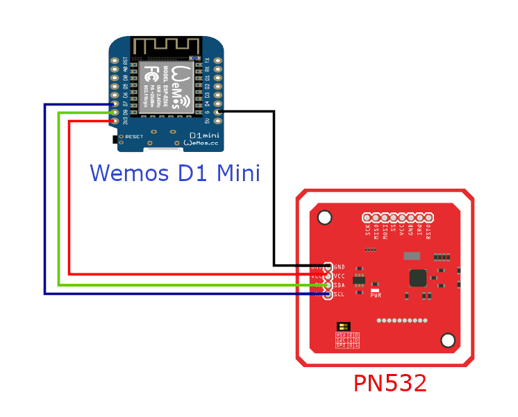 The circuit is straightforward: connecting an NFC reader module (PN532) to a microcontroller (ESP8266 WeMos D1 mini).
