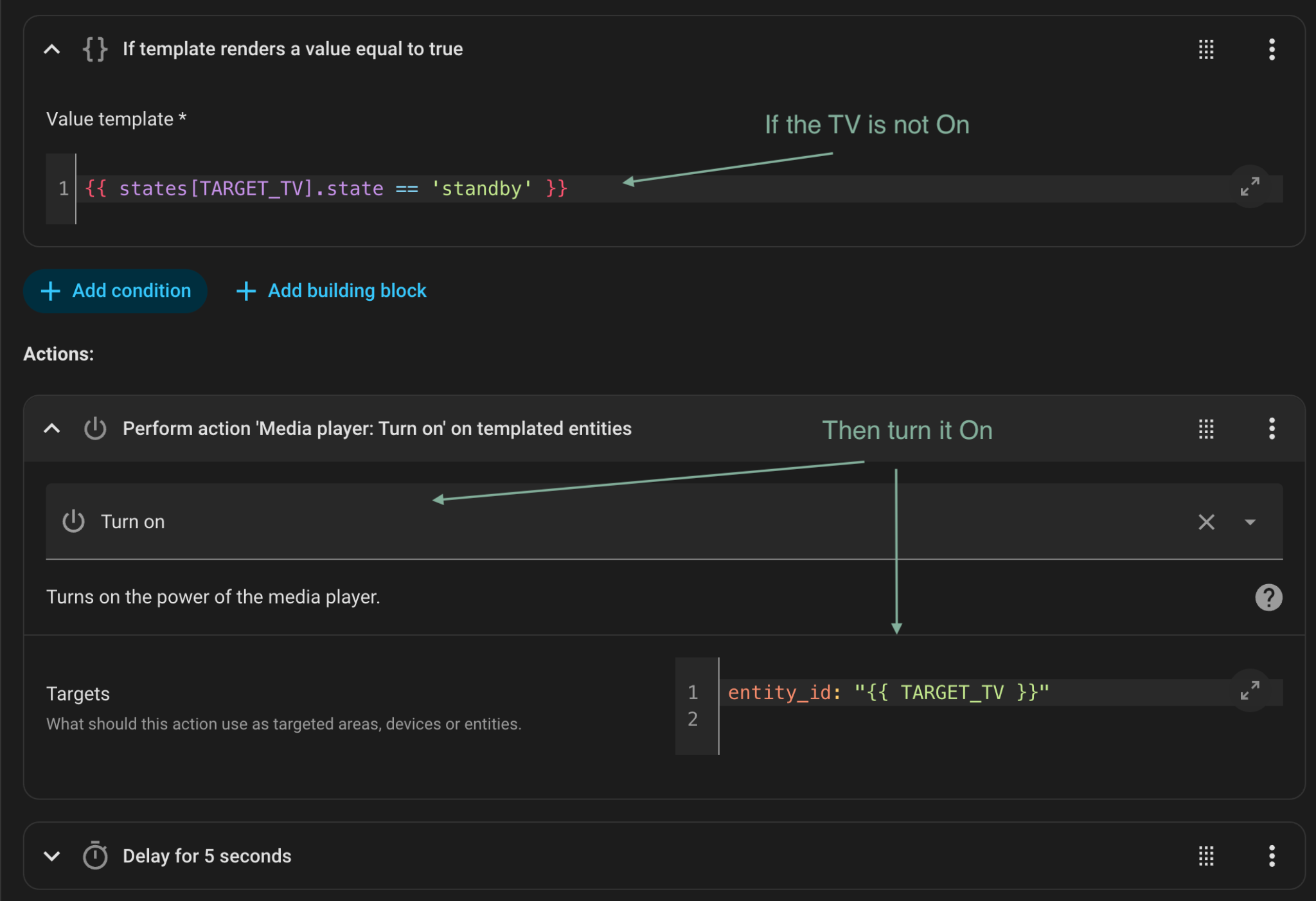 The TARGET_TV variable holds the TV we’re targeting, we’ll check its status and turn it on if needed.