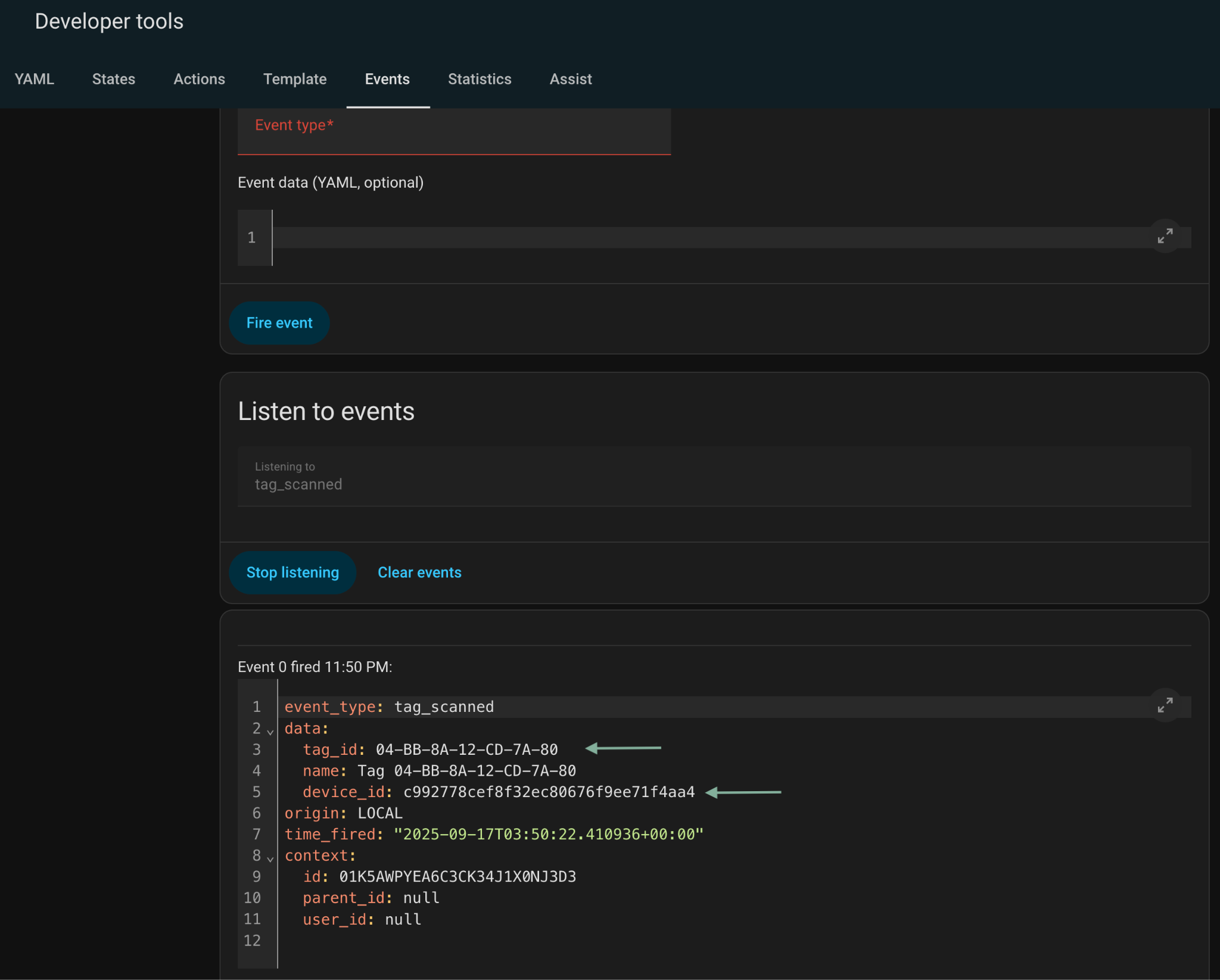 From there, the scanner can report any NFC tags it detects. Home Assistant has an Event Listening feature under Developer Tools, a quick scan of any card, while listening to “tag_scanned” events, will show some useful data for the card and the tag scanner. tag_id is the card’s unique ID and device_id is the tag scanner’s unique ID.