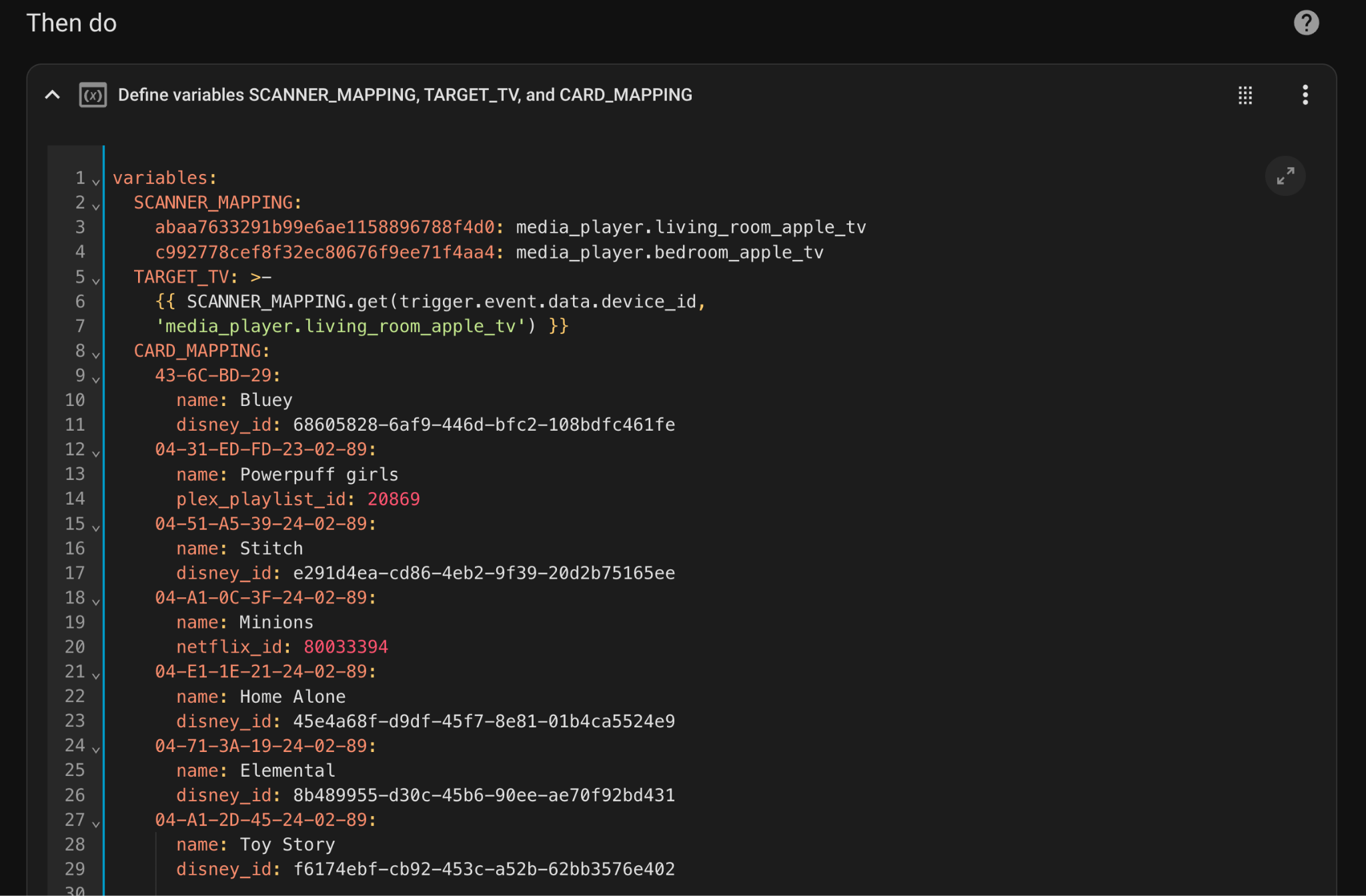 - TARGET_TV - This variable resolves to the TV entity the automation needs to target, based on the Scanner ID that was provided by the tag_scanned event (trigger.event.data.device_id = The Scanner ID). This also defines the default TV in case the scanner is not mapped to any specific TV (In this case, the default is Living Room TV).