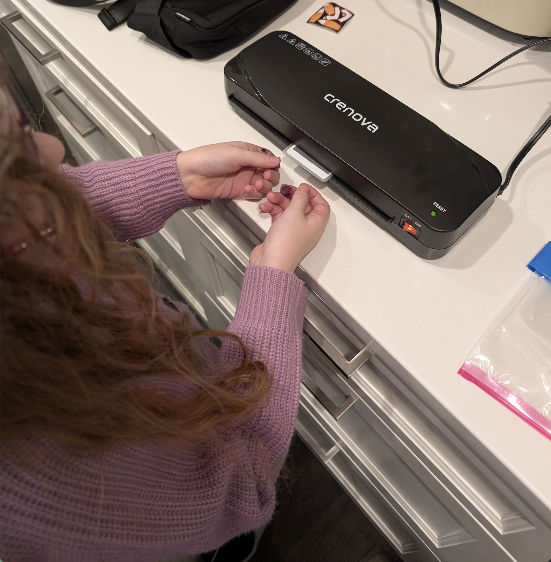 The printed poster we put on top of the card, slipped into a Laminating Pouch and from there straight to the laminating machine. The one I got is cheap (under $20) and it served us well in several projects, definitely nice to have around the house.