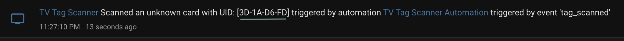 Once the physical card is ready, the final step is onboarding it into Home Assistant. To make things easier, I’ve added to the automation a fallback in case we scan a card that’s not assigned to any content, which prints the card’s Tag ID to Home Assistant’s Logbook.